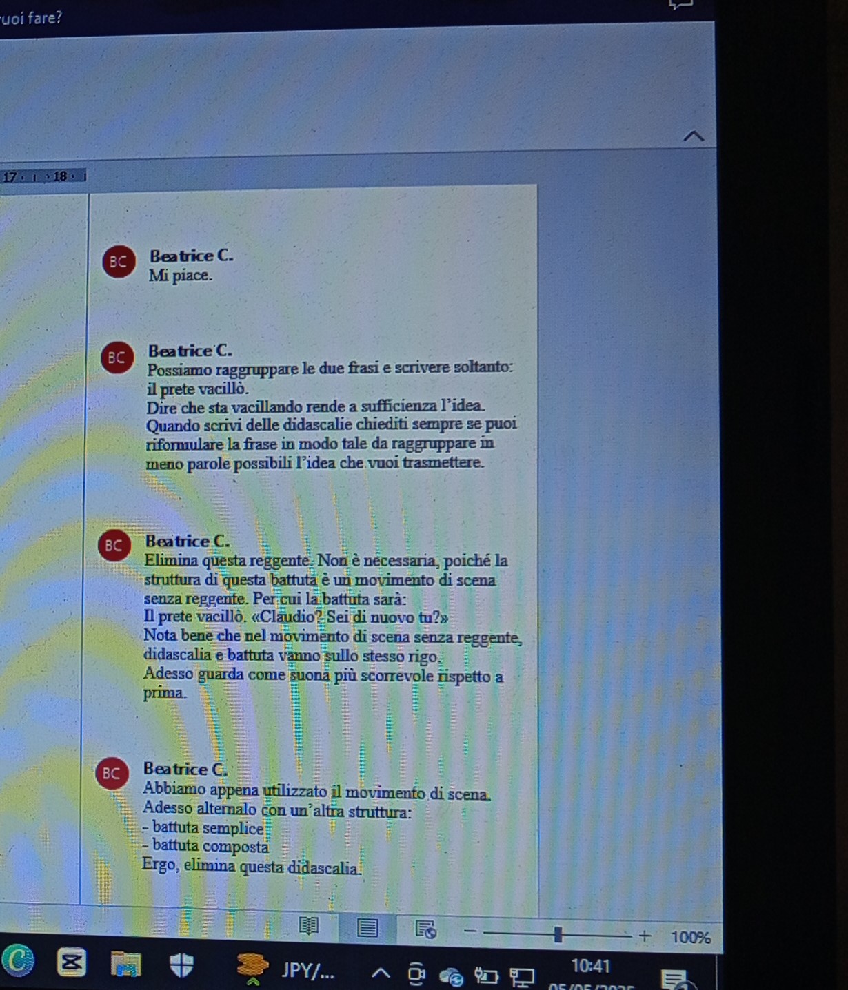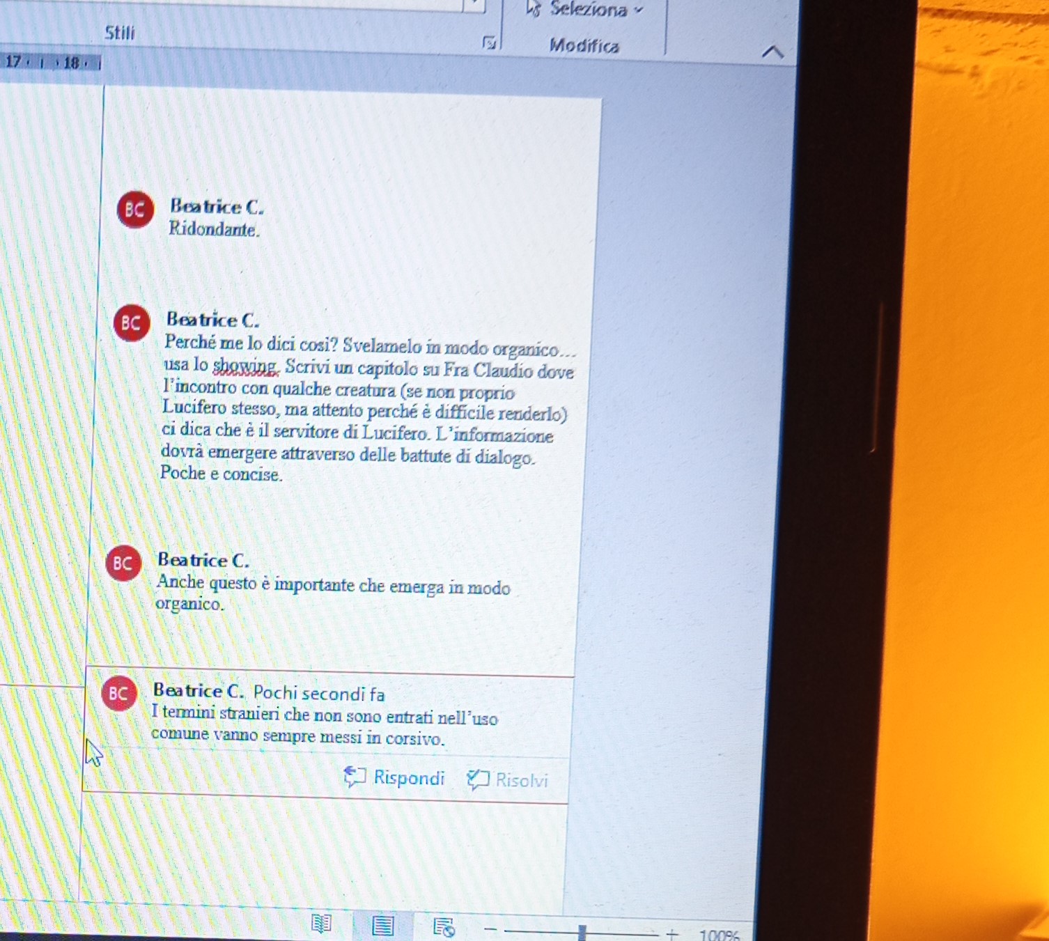 Il tutto avviene tramite commenti mirati utili a te – autore e scrittore – per comprendere appieno dove e come lavorare per affinare il tuo romanzo. Ecco un esempio di alcuni commenti che inserisco durante il processo di editing: